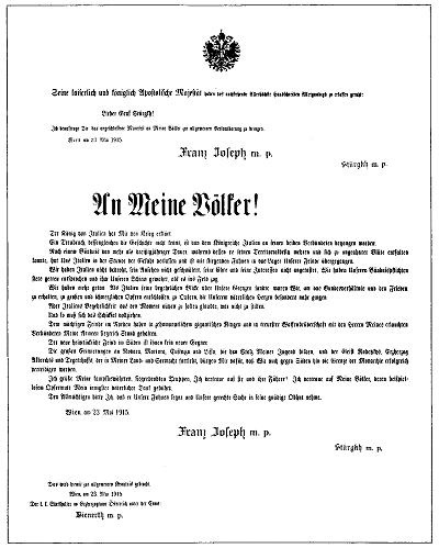 Josef m. P. An Meine Völker! Der König von Italien hat Mir den Krieg erklärt. Franz Josef m. p. 1) |