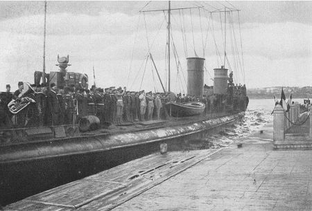 Ankunft eines türkischen Torpedobootes mit der Besatzung der "Emden" unter Kapitänleutnant v. Mücke