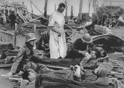 verwundete Deutsche nach der Einlieferung beim englischen Verbandplatz bei Potijze